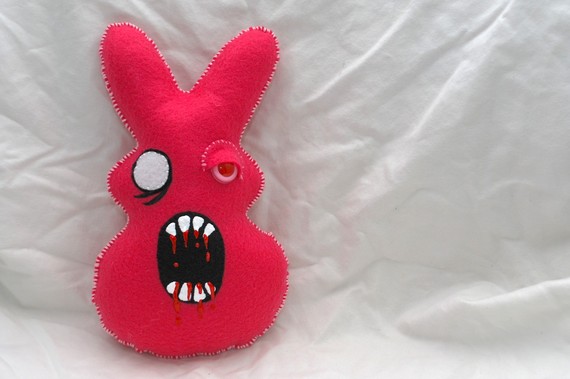 I was going to try to save this guy from She Lost it for Easter, but I have no willpower when I like something this much! So let's just pretend it is spring and enjoy this splendid zombie bunnymonster! Now I know we have talked many times about the exponential growth in bunnymonsters that we've seen since 2000, and the steps one should take to protect oneself and possessions, but with an infestation the size of this one, I think it bears repeating! The bottom line, keep zombie vegetables around, and try to befriend the bunnies that approach you. It's humanity's only hope!